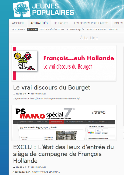Par exemple, en ce moment, sur Facebook, c’est un peu le bordel : impossible de vous connecter sans vous retrouver avec des gens relayant des tonnes de trucs sur « Pourquoi mon candidat c’est le plus gentil du monde » ou « Pourquoi les autres sont bêtes et méchants et sentent le prout » , et de préférence, le second (si vous avez un doute sur le sujet, je vous propose deux captures d’écran, l’une des jeunes populaires, l’autre des jeunes socialistes : c’est tellement caricatural que si vous regardez bien, pour savoir qui propose quoi, il faut consulter le site du camp d’en face ; les autres formations politiques me pardonneront de ne me concentrer que sur les deux principales, mais sinon, je risque de ne pas être couché de suite). Du coup, encore une fois, la question se pose :