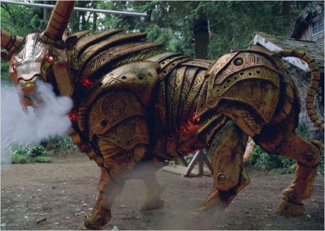 Bref. Alors que tout ce petit monde prend un peu de temps pour faire connaissance, et que l’on découvre qu’Annabeth n’aime pas vraiment les cyclopes, obligeant Tyson à porter des lunettes de soleil pour camoufler sa choquante différence (qu’est-ce que ce serait si elle ne vivait pas dans un monde rempli d’être mythiques), un autre événement inattendu se produit bien vite. A savoir que le camp est remué par de terribles secousses, et on entend des chocs sourds : quelque chose est en train de s’attaquer à la barrière magique ! Vite, tous les larrons du camp se dirigent vers l’origine du bruit, mais sans armes des fois que ce soit juste un type qui fasse ça pour rigoler, et à leur grande surprise… la barrière se brise, et un immense taureau d’airain apparaît, galopant dans leur direction avec des intentions vaguement hostiles !
