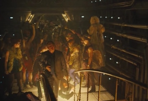 Pas de problème, ce film est un gros étron pour rester courtois : soudain, tous les types équipés de hache sortent de leurs poches… des lunettes de vision nocturne. Parce que là encore, les derniers survivants de l’humanité se sont dit que vraiment, c’était du matériel de première nécessité dans un train illuminé en permanence. Et c’est bien là la ruse : le train passe dans un tunnel, les lumières sont éteintes par les vilains et… commence alors un massacre puisque les amis des haches peuvent défoncer en paix leurs ennemis qui se retrouvent aveugles.