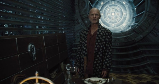 Si l’avis de la plupart des passagers est que cela signifie « Celui qui lit ça est un con » en coréen ou un nom de soupe Liebig, Curtis a une toute autre idée : grâce à ses connaissances encyclopédiques tirées de son… sa… hem, ses connaissances encyclopédiques parfaitement justifiées, il sait que Minsoo est un expert en sécurité qui pourrait ouvrir les portes des voitures du train et donc leur ouvrir la voie vers l’avant et ses richesses. Curtis va donc en parler à Gandalf, le vieux sage manchot du train. Gandalf est en effet un des ingénieurs ayant bossé sur le Snowpiercer, mais après s’être visiblement fait doubler par Wilford, l’actuel propriétaire du train, il a fini en 3e classe. Feinté, papy. Les deux papotent donc d’un plan à mettre en place pour aller trouver Minsoo, qui serait retenu dans la voiture-prison plus à l’avant, et c’est l’occasion d’aborder un sujet qui reviendra en boucle avec toutes les personnes que Curtis va croiser :