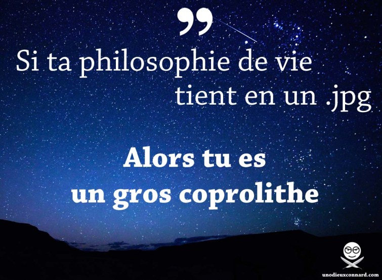 Citation de vieux philosophe, discours courageux sur les hypocrites qui sont rien que des méchants ou image de ciel nocturne avec une phrase toute faite, rien n’est épargné à quiconque visite leur page et n’en repart qu’avec l’étrange sensation qu’une licorne arc-en-ciel a tenté dans les éborgner. C’est donc avec 1/10e de moins à chaque œil que l’internaute raisonnable ferme son navigateur avant d’aller pleurer en boule dans un coin de se chambre pour oublier ce tsunami de vomi pailleté.