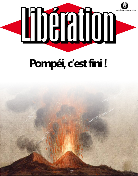 Le Vésuve serait encore chaud que déjà, l’équipe calembours & palindromes de Libération (73 personnes, 26% du budget du journal, du moins, c’est ce que je suppose vu les unes) serait sur les rangs. Référence musicale, jeu de mot honteux ou blague digne des Grosses Têtes, le journalisme va bien, merci. Et c’est un journal national : c’est dire où nous en sommes.