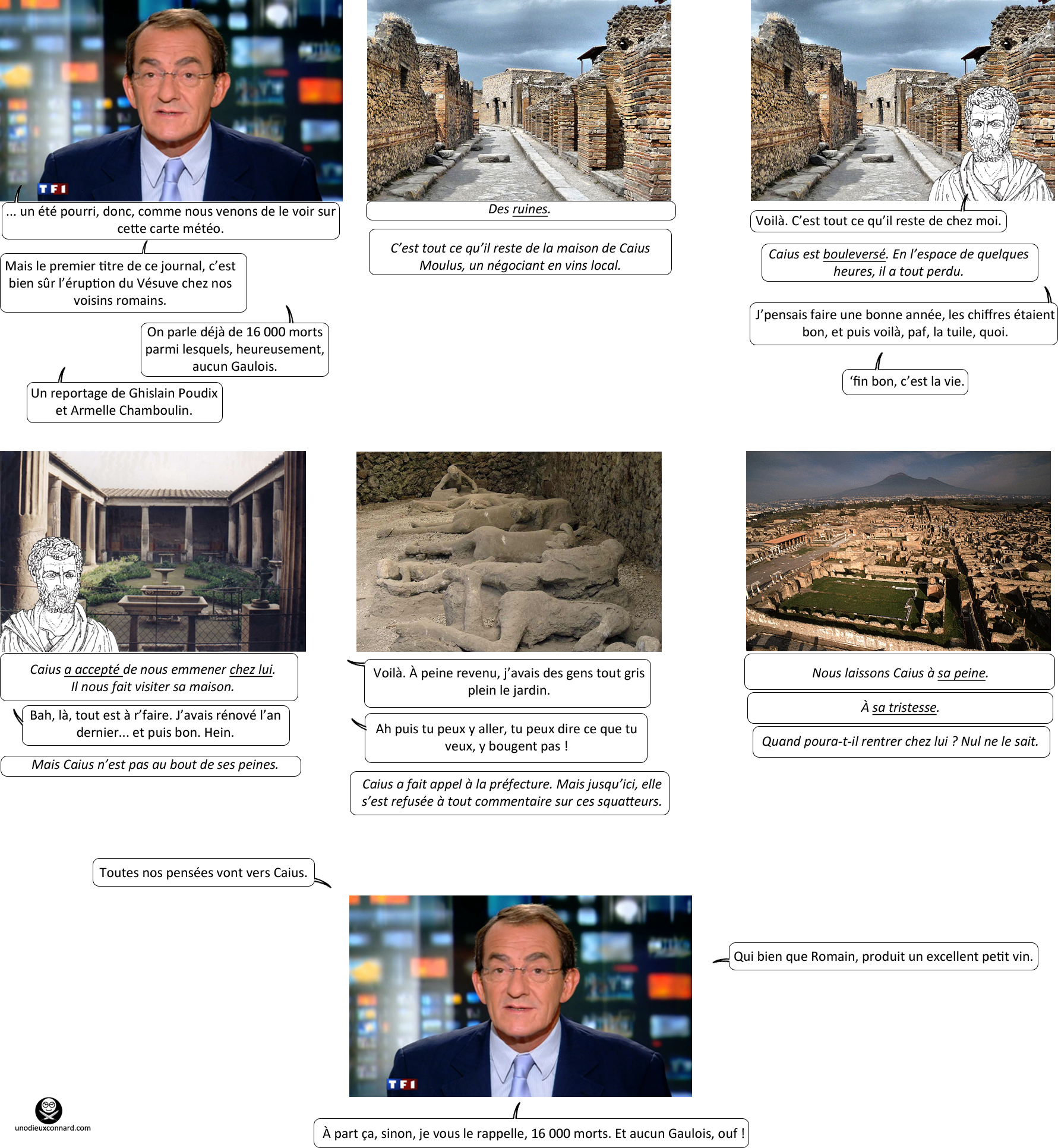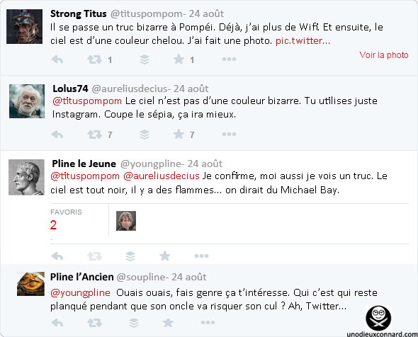 – Franchement, je souhaite bien du courage aux générations futures. Non parce que sérieusement, vous imaginez, vous, si on avait eu tous nos médias actuels à l’époque de la fin de Pompéi ?