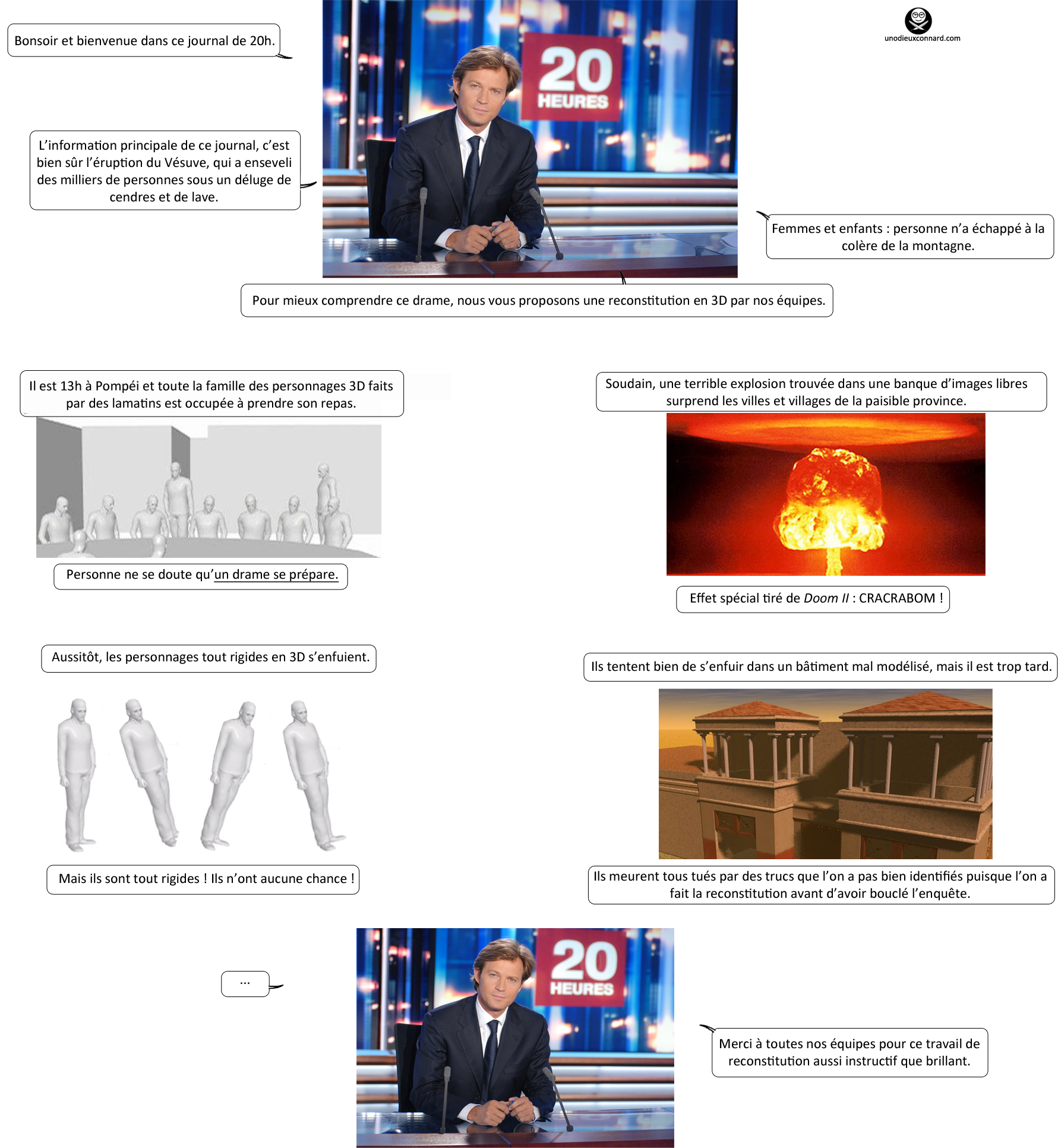 26. Ah… Le retour de l’Odieux Connard, et en très grande forme ! Cela valait largement le coup d’attendre quelques jours de plus ! Vous n’imaginez pas mon grand sourire quand j’ai vu que vous aviez publié un nouvel article – sourire qui s’est bien vite transformé en rire, comme il se doit ! Je pense que ma partie préférée est celle de TF1 ; « des ruines » au tout début est criant de vérité, on s’attend à presque à entendre la voix désincarnée de service !
