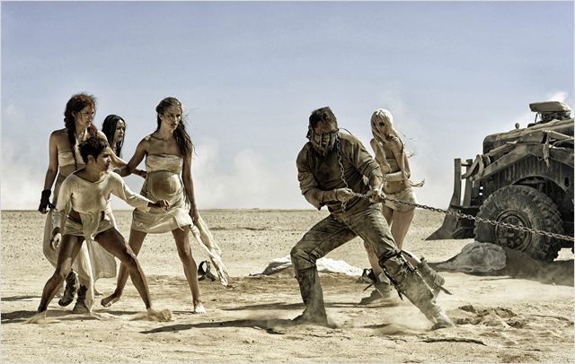 Max, satisfait de ce rebondissement aussi mauvais qu’incohérent, charge donc Fifi sur ses épaules, sa portière, et le fusil enrayé à la main, marche tranquillement jusqu’au camion, où il découvre Furiosa en train de tenter de bricoler, mais surtout, quatre donzelles tout à fait agréables à son œil de vieux clodo du désert, seulement vêtues de petits draps blancs, et qui s’arrosent copieusement avec un tuyau d’arrosage relié au camion façon car-wash pour beaufs.