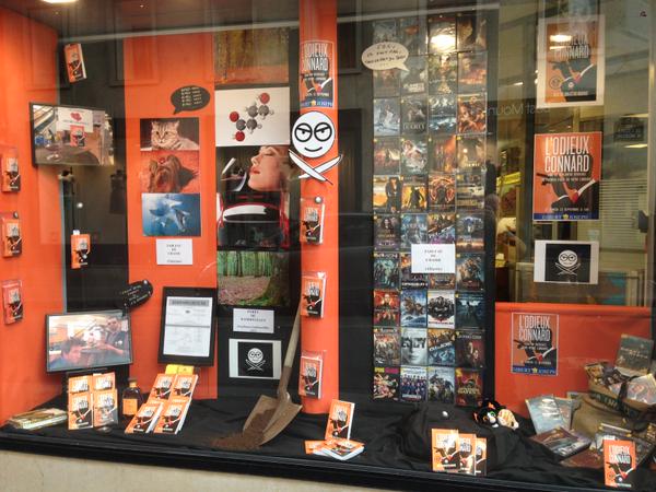 Tout d’abord, je passerai donc par Paris, afin de rencontrer le turbulent peuple de la capitale. Et pour ce faire, j’irai dans une ambassade du bon goût qui a eu l’excellence de dresser une vitrine entière à ma gloire : chez Gibert Joseph. Et je le prouve avec cette image dans laquelle on retrouve aussi bien des livres que des photos de yorkshire, une pelle, un sac de chatons à noyer, des jaquettes de films spoilés, et moult autres choses bref, on sent bien qu’on ne rigole pas trop avec ce blog par là-bas. Serious business.