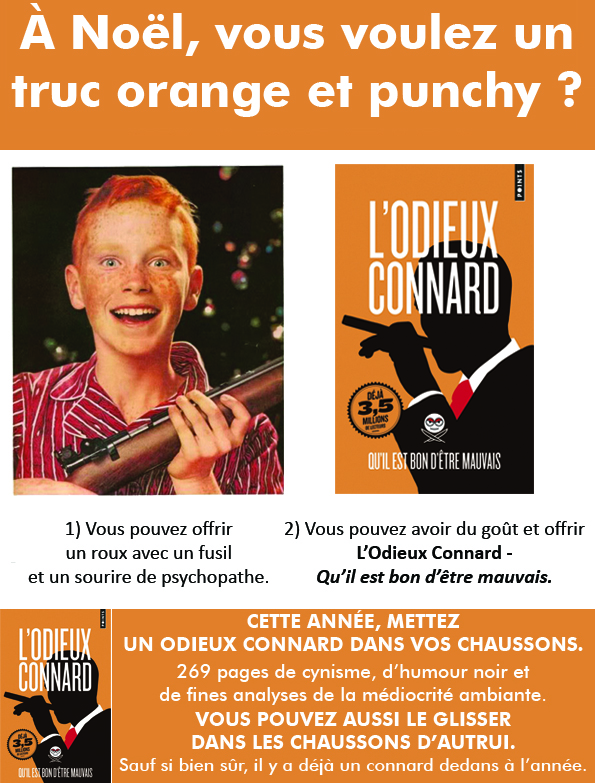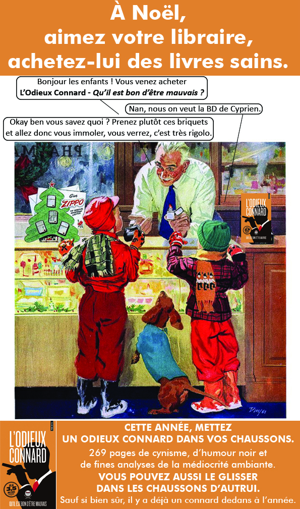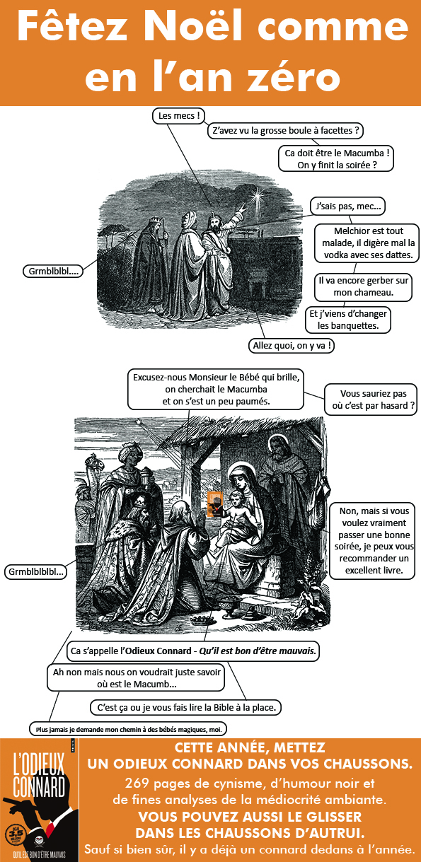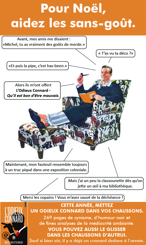 En attendant, cher public, voici de quoi décorer vos demeures & librairies. Et vous rappeler que pour vos courses de Noël, oubliez les tristes cadeaux habituels  : un Odieux Connard dans les chaussons, ça sort de l’ordinaire.