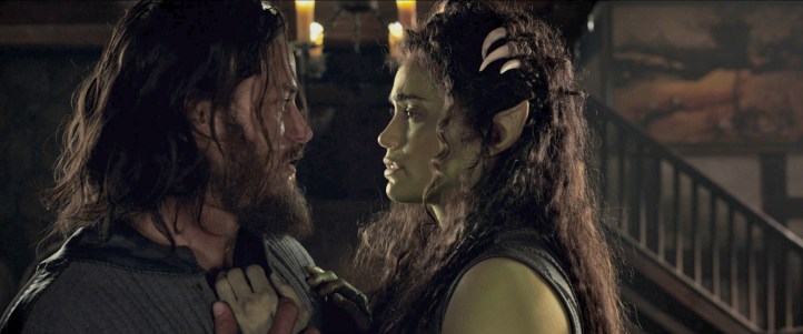 Passons sur la séance d’interrogatoire où la prisonnière n’est pas attachée, est libre de se promener dans toute la salle, de tripoter le trône, et éventuellement, de s’y asseoir si le cœur lui en dit, fais-toi plaiz’, tu veux un petit chocolat chaud, aussi ? Ça devient quand même méchamment ridicule à ce stade, et disons-le : les acteurs ne sont quand même pas très bon, d’habitude, je veux bien passer l’éponge, mais là, c’est un peu le festival du meilleur imitateur de Nicolas Cage. Toujours est-il que l’orc explique bien des choses aux humains, parce qu’elle est comme ça, et que les orcs la traitaient mal, alors bon, hein ! Toujours est-il que ça discute sec avec le roi.