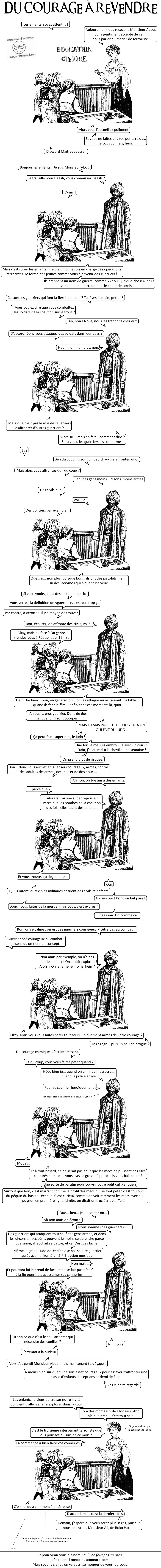 J’aime votre mauvaise foi d’une manière générale et c’est très louable à vous de vouloir faire rire des terroristes, mais : d’une part le thème « les terroristes sont lâches » est très consensuel et largement rebattu ; d’autre part votre réplique sur les enfants tués « par erreur » par la coalition est clairement du même niveau dialectique que votre Abou. Quand on détruit méthodiquement les infrastructures d’un pays à coup de bombes, des enfants vont mourir, si ce n’est pas directement des bombardement ce sera de faim ou de maladie. Alors le « oui mais on fait pas exprès » vous m’excuserez mais ça ne vaut pas une queue de pelle.