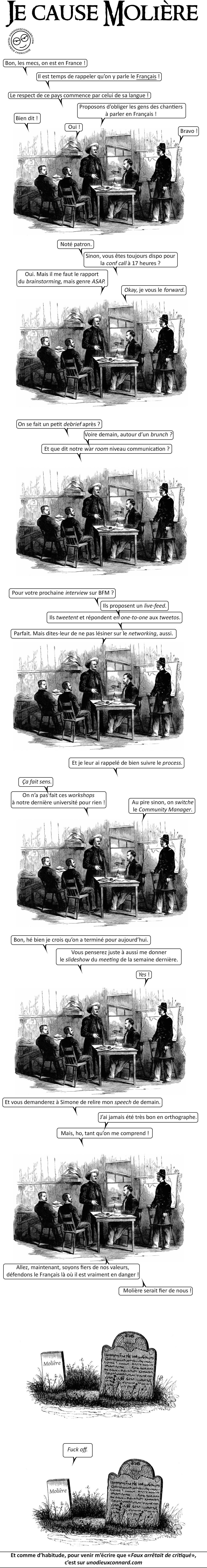 « Les ouvriers DOIVENT parler français, notre langue est sacrée, il faut la préserver ! Protégeons la langue de Molière ! Bon, je vous laisse, mon manager vient d’appeler, à demain pour le debrief ! Amenez de quoi se faire un petit brunch ! »