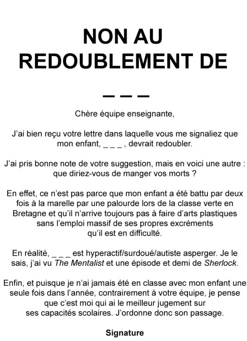 Parents, vous craignez que votre enfant, qui ne sait ni lire, ni écrire et encore moins compter à 14 ans ne doive redoubler son CP (il a eu une maternelle difficile) ? Pas d’inquiétude, vous aussi, vous pouvez glisser dans le cartable de votre chérubin un mot pour éviter ce genre de désagréments. Vous n’allez quand même pas vous déplacer pour discuter avec les enseignants eux-mêmes, que diable ! Car n’oubliez pas ce principe basique : plus un enfant fait chier, moins on voit ses parents. La rumeur raconte que c’est pareil à la maison, mais qui suis-je pour juger ?