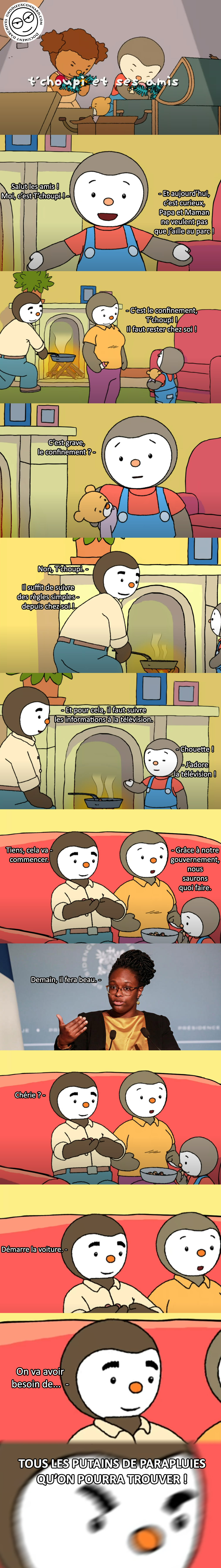 Votre serviteur vous propose donc trois épisodes exclusifs de Petit Ours Brun, T’Choupi et de L’âne Trotro. Nul doute que la lecture permettra à vos enfants de se distraire tout en comprenant mieux le monde qui les entoure. Quant à vous, si vous vous apprêtez à regarder notre Président ce soir (les Québecois & Belges qui me lisent ne savent pas ce qu’ils ratent), je vous conseille particulièrement l’épisode de T’Choupi, qui vous rappelle comment réagir face à n’importe quelle déclaration gouvernementale.