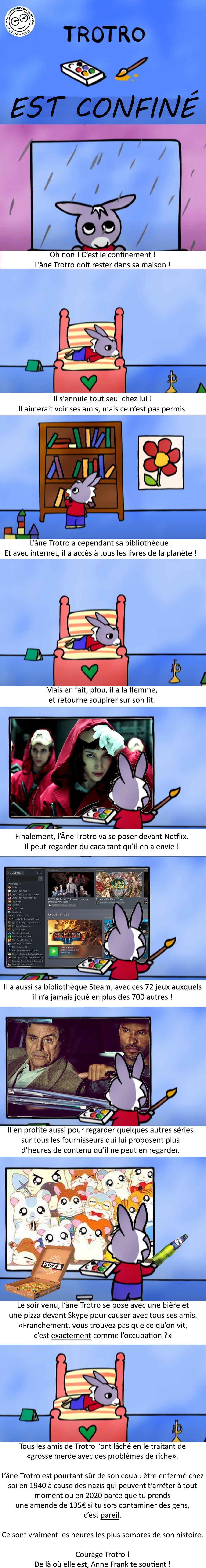 Bien que la mauvaise foi fasse partie de la charte de ce blog, il y a surtout de l’ironie ici : l’histoire de Trotro se moque justement de ceux confinés chez eux avec tout le confort moderne et qui osent comparer le confinement à la guerre, de la même manière que la version Tchoupi se moque de ceux qui paniquent et réagissent à l’excès.
