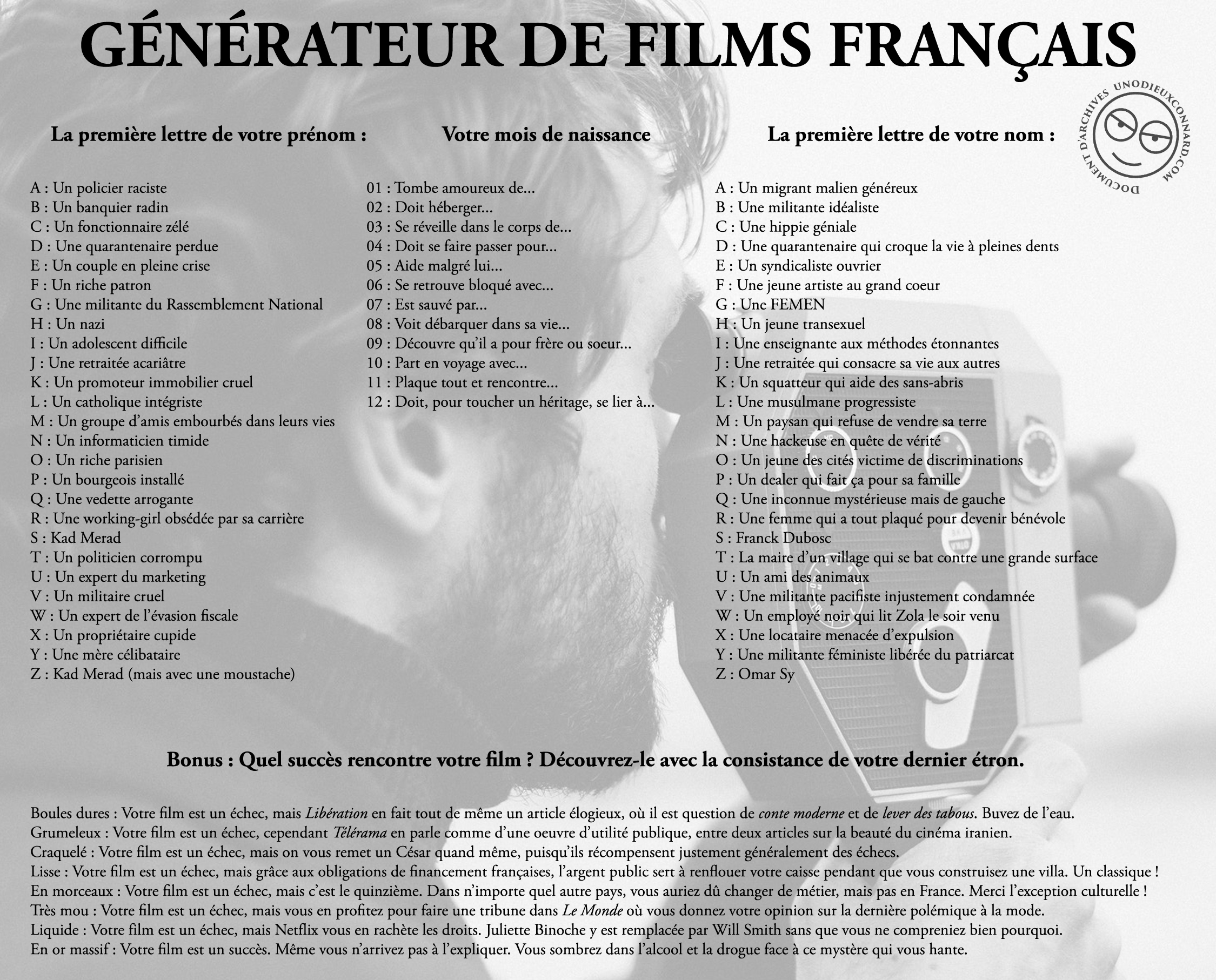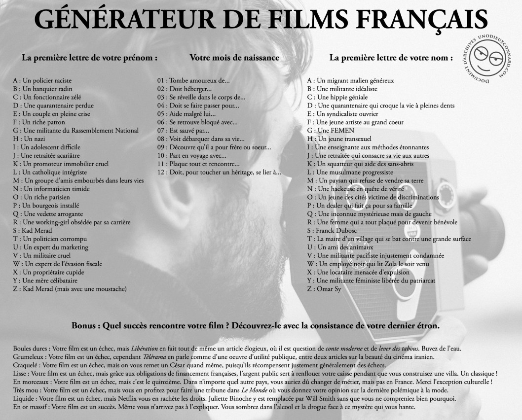 Et puis, nous le savons, le cinéma français, c’est surtout une exception culturelle qui permet de varier les sujets, de prendre des risques, de ne jamais être là où on l’attend. Et comme la jeune génération s’y intéresse trop peu, et préfère rester sur les réseaux sociaux à découvrir « À quel âge vas-tu te marier en fonction de la première lettre de ton prénom ? » je me permets, en humble vulgarisateur, de faire se rencontrer ces deux mondes avec le document suivant, qui permettra à tous de découvrir la richesse culturelle de notre industrie. Et à certains réalisateurs de gagner du temps, ne le cachons pas.