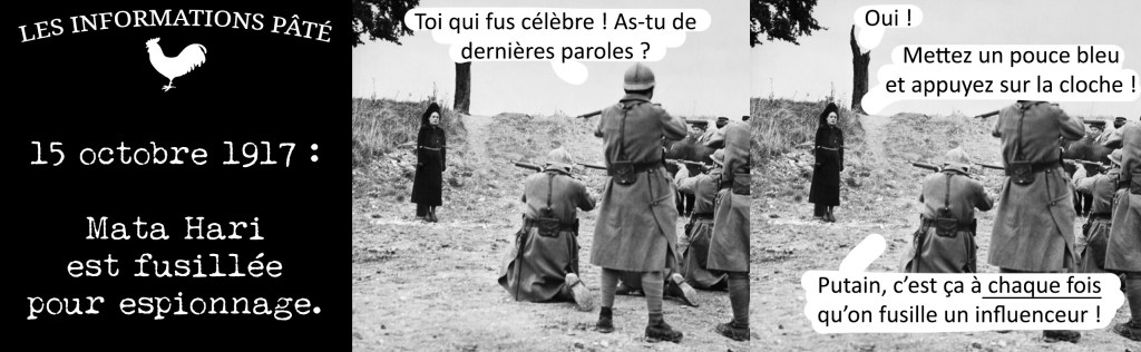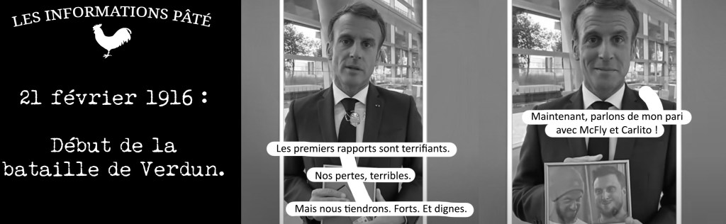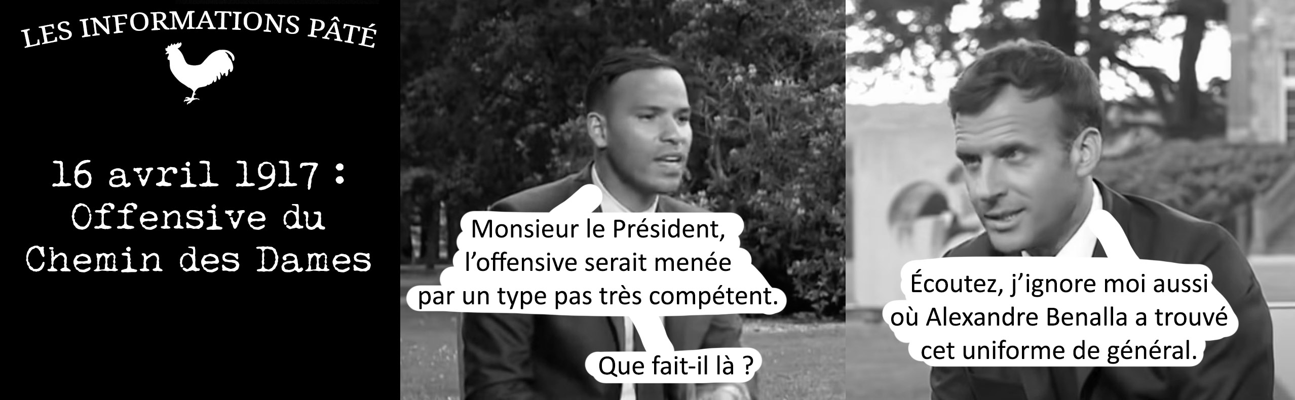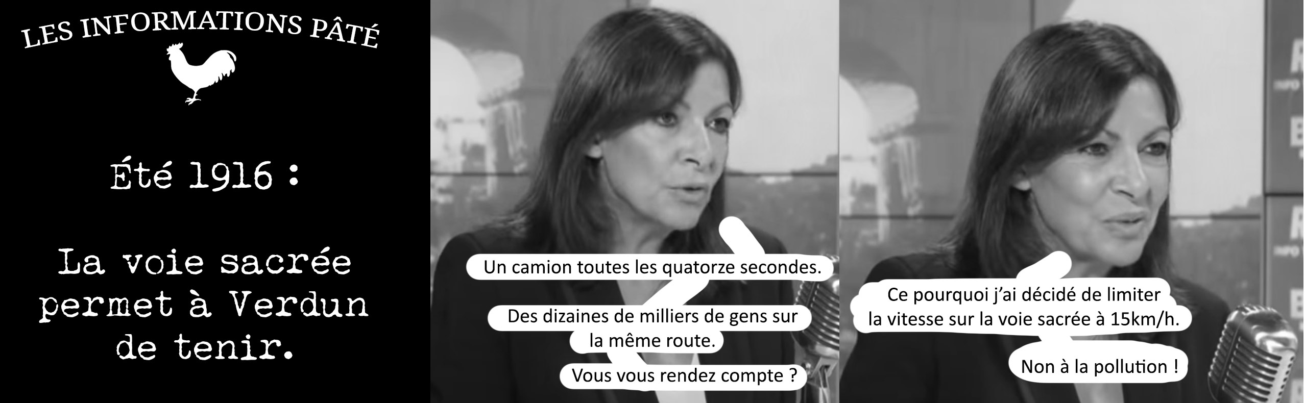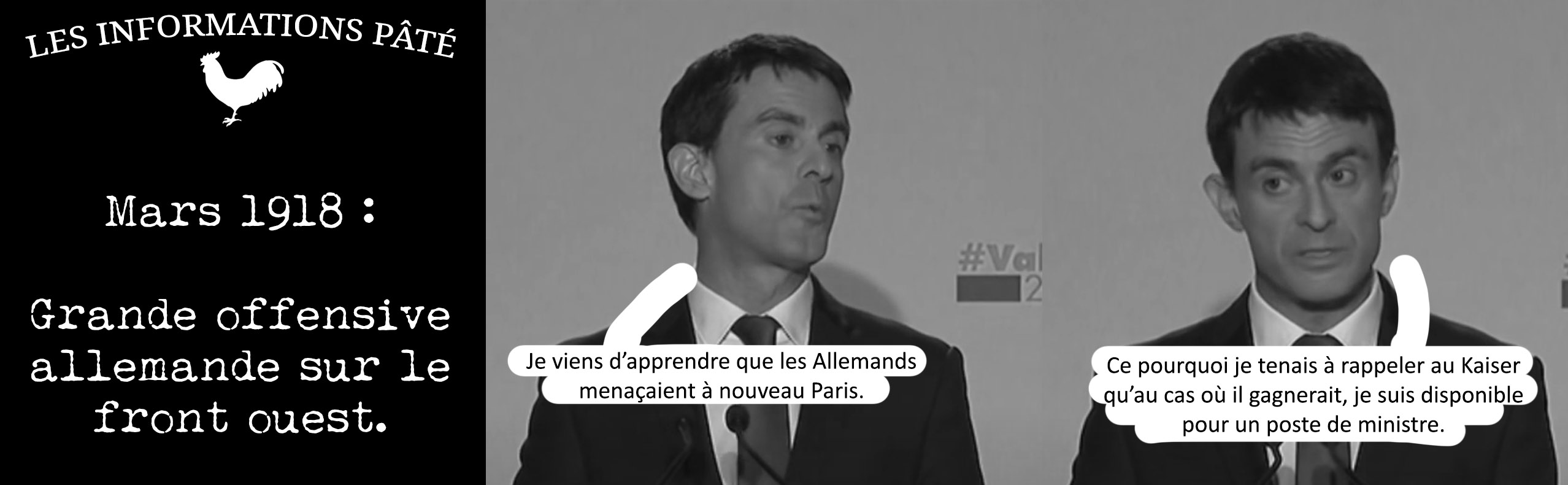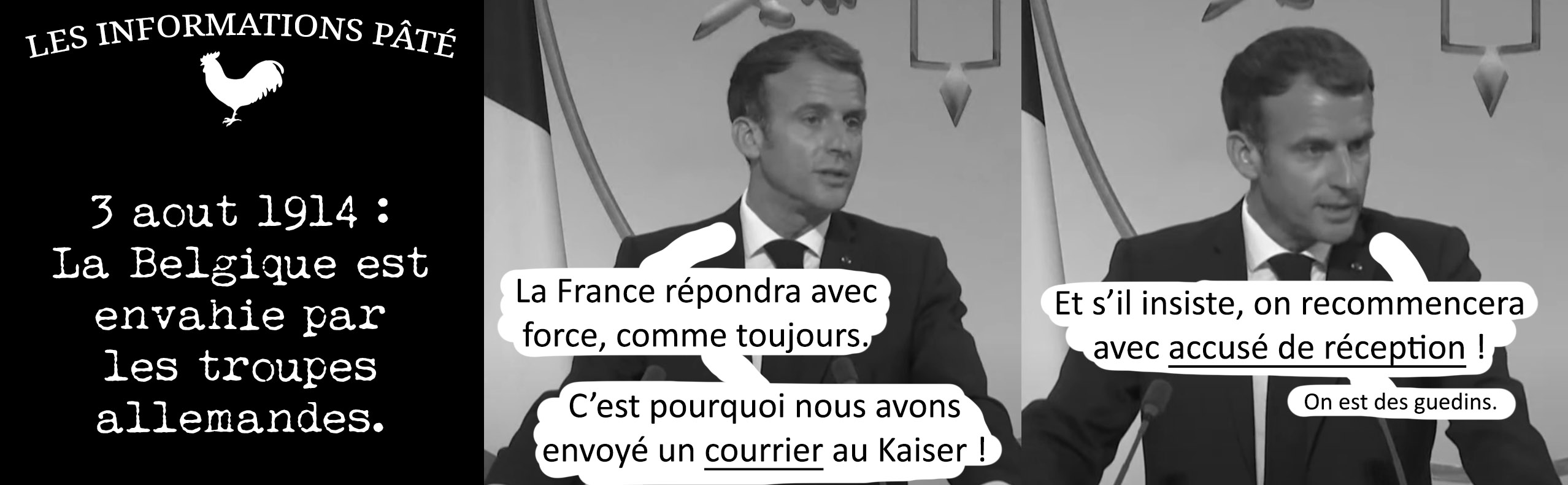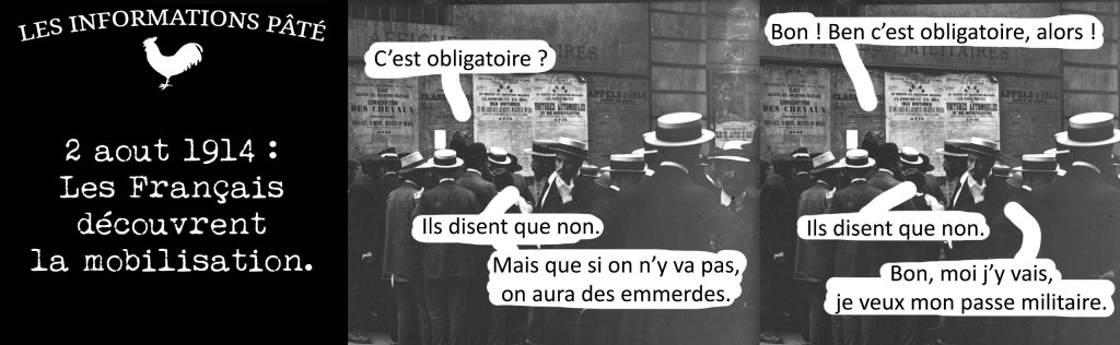 1914 : tiraillée entre les pro-mobilisation et les anti-mobilisation, le gouvernement en période électorale annonce que la mobilisation sera facultative et sur la base du volontariat mais que bon il faut y aller sinon ça va chier. Une campagne « La mobilisation ? Moi aussi, j’y vais ! » est lancée. Ce n’est que lorsque Francis Lalanne propose de chanter pour les antis que la plupart partent pour le front sans faire d’histoires.